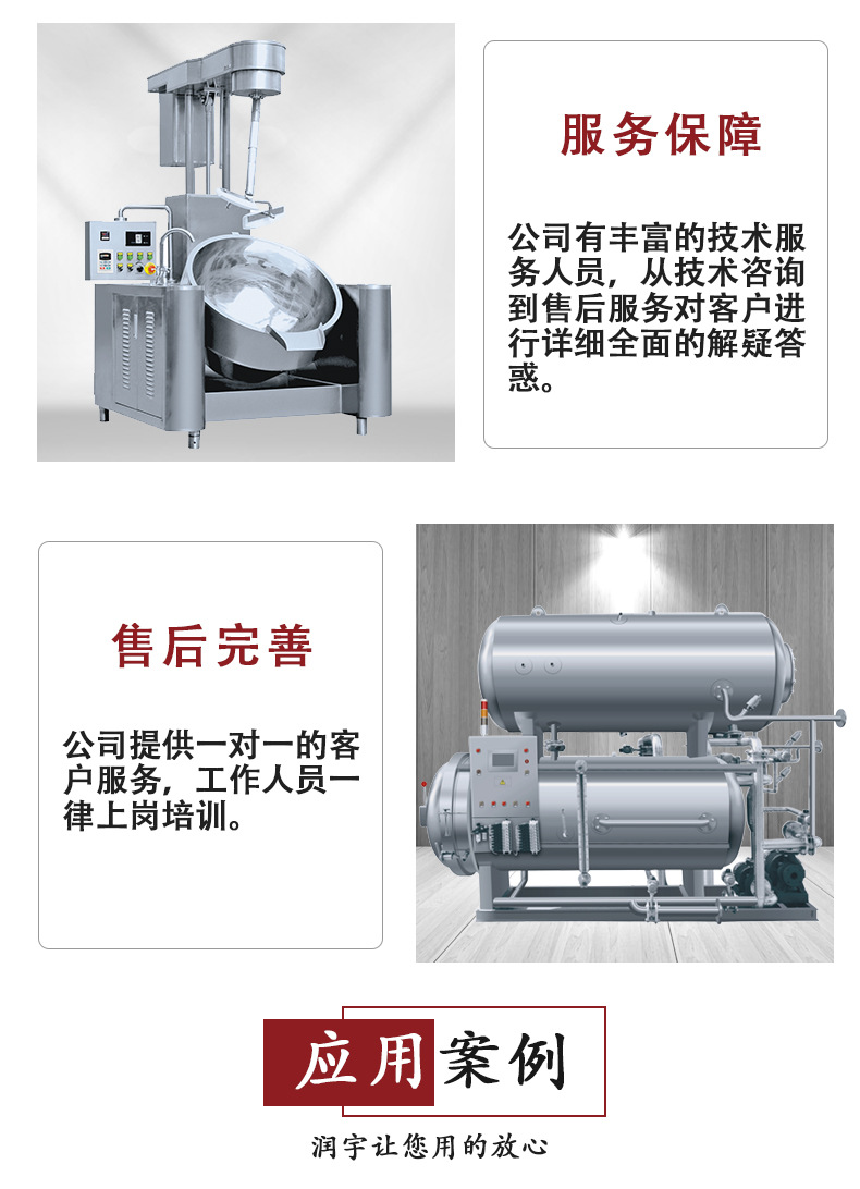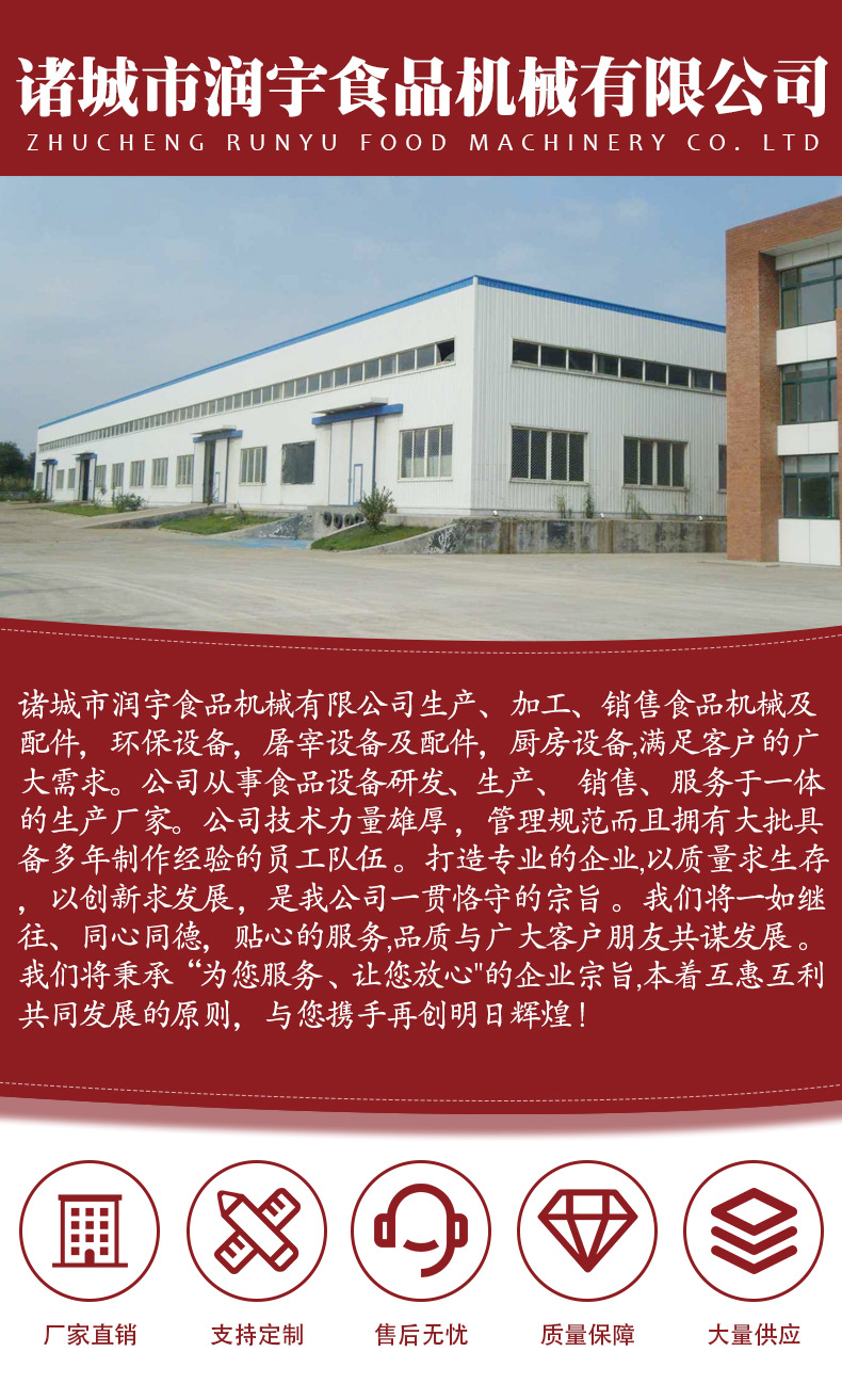 诸城市润宇食品机械有限公司专业生产,加工,销售食品机械及配件,环保设备,屠宰设备及配件,厨房设备,满足客户的广大需求。公司拥有专业的技术,从事食品设备研发、生产、销售、服务于一体的专业生产厂家。公司技术力量雄厚,管理规范而且拥有大批具备多年制作经验的员工队伍。 打造专业的企业,以质量求生存,以创新求发展,是我公司一贯恪守的宗旨。我们将一如继往,同心同德,以优质的产品、贴心的服务,专业的品质与广大客户朋友共谋发展。 我们将秉承“为您服务、让您放心"的企业宗旨,本着互惠互利共同发展的原则,与您携手再创明日辉煌! 感谢各界朋友多年来对我们的大力支持与信赖,您的满意是我们不懈的追求,您的成功是我们的期盼,您的建议是我们的荣幸,更希望广大客户、各位朋友多提宝贵意见。